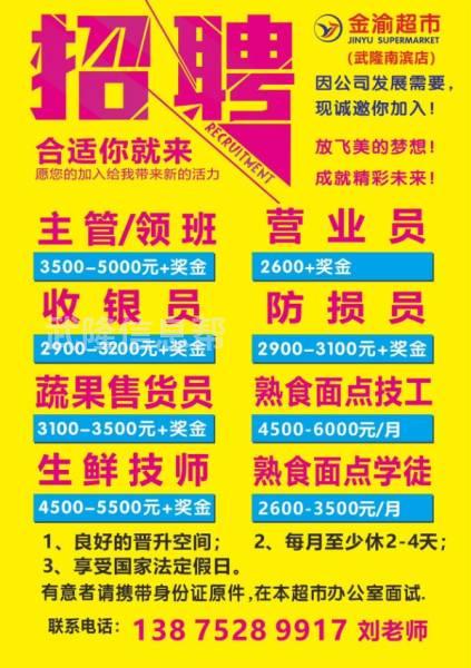 金渝超市(武隆南滨店)招聘信息因公司发展需要,现诚招以下岗位人员:
