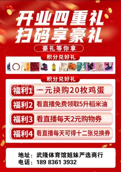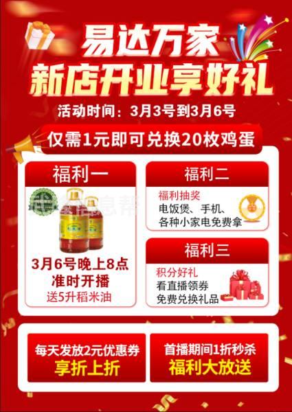 新年福利亲爱的朋友们我们店开年福利又来了,凡到店支付1元得20枚鸡蛋,同时在直播间还可以得10斤稻米油一桶,活动时间3月2号6号晚上5点,身边没有看直播的也可以介绍过来,她们享受所有福利的同时介绍1位你得5枚2位10枚以此内推,数量有限,先到先得,谢谢大家一年来的支持和包容